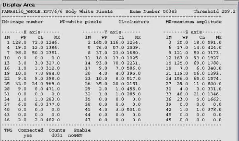 13. เชื่อมต่อสาย DD อีกครั้งที่ Pen Wall ถอดสายเคเบิล BNC ของ Body และ Head T/R Bias ที่ SSM.EPT พิกเซลสีขาวและการสแกนตัวเครื่อง ผลลัพธ์ก็คือล้มเหลวทั้งหมด เชื่อมต่อสายไบแอสของร่างกายและศีรษะที่ถอดออกแล้ว ถอดสายเคเบิลเอาต์พุตส่วนหัวและลำตัวในการสแกนพิกเซลสีขาว SRFDII.EPT ผลลัพธ์ก็คือล้มเหลวทั้งหมด ยืนยันว่าปัญหาไม่ได้อยู่ใน SRFDII AMP และ SSM